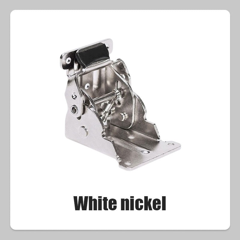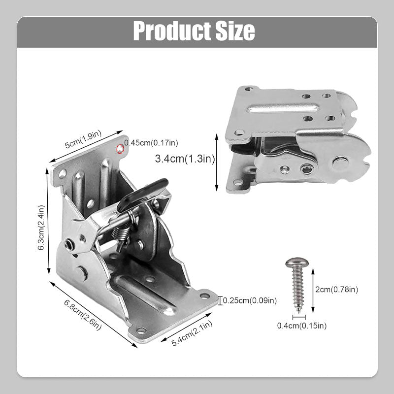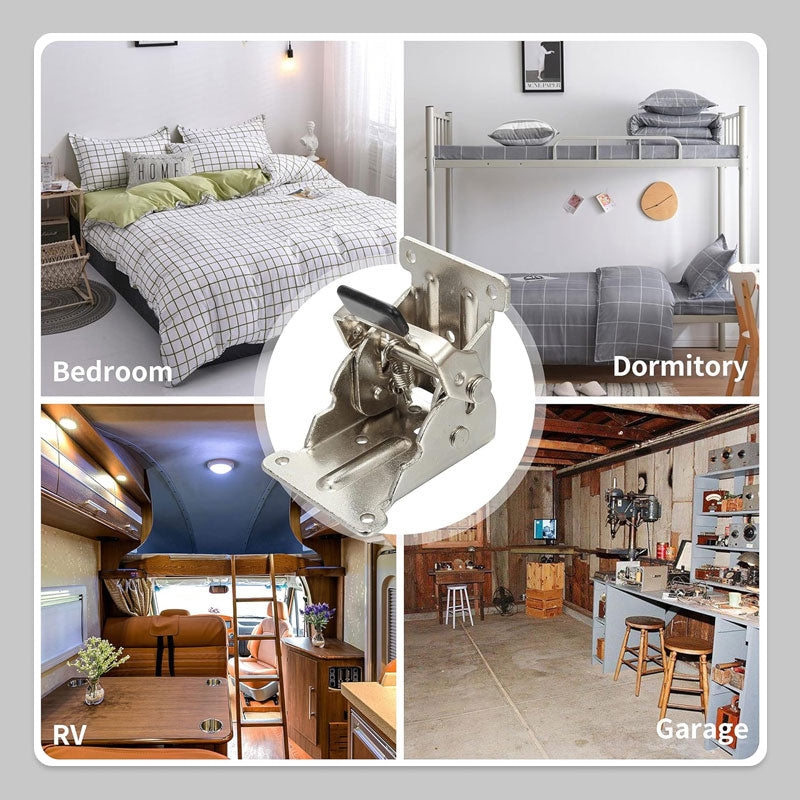 Självlåsningsfunktion : För att öka säkerheten har dessa fästen en fjäderaktiverad självlåsningsfunktion som kan fixeras genom att låsa i öppet läge. När du inte använder ett skrivbord eller en arbetsbänk klickar du bara på spärren och fäller ner den för att få mer utrymme.