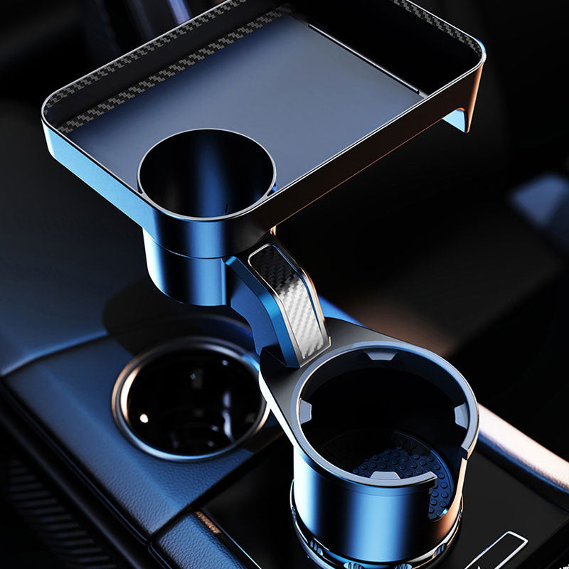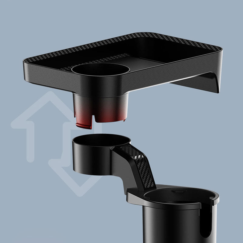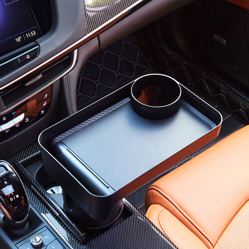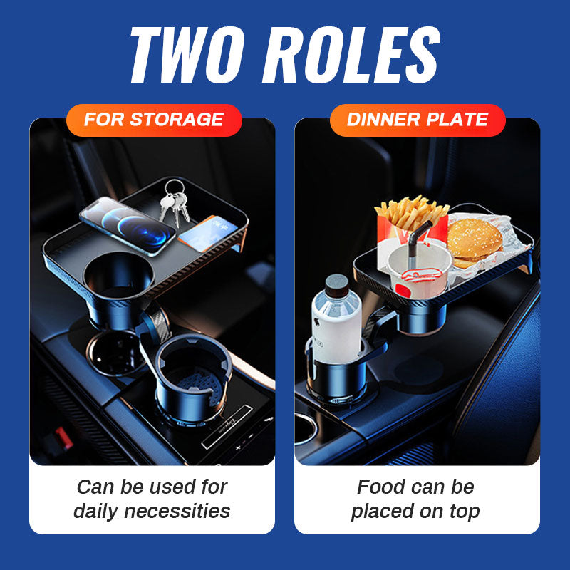Den justerbara mugghållarbrickan, som fästs i framsätets eller baksätets mugghållare, ger en bekväm plats för dina favoritsnacks, hamburgare, pommes frites, snabbmatslådor, nycklar och andra småsaker.