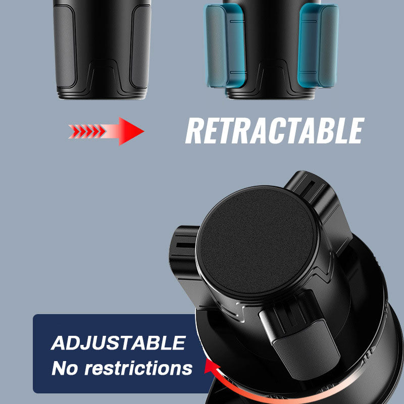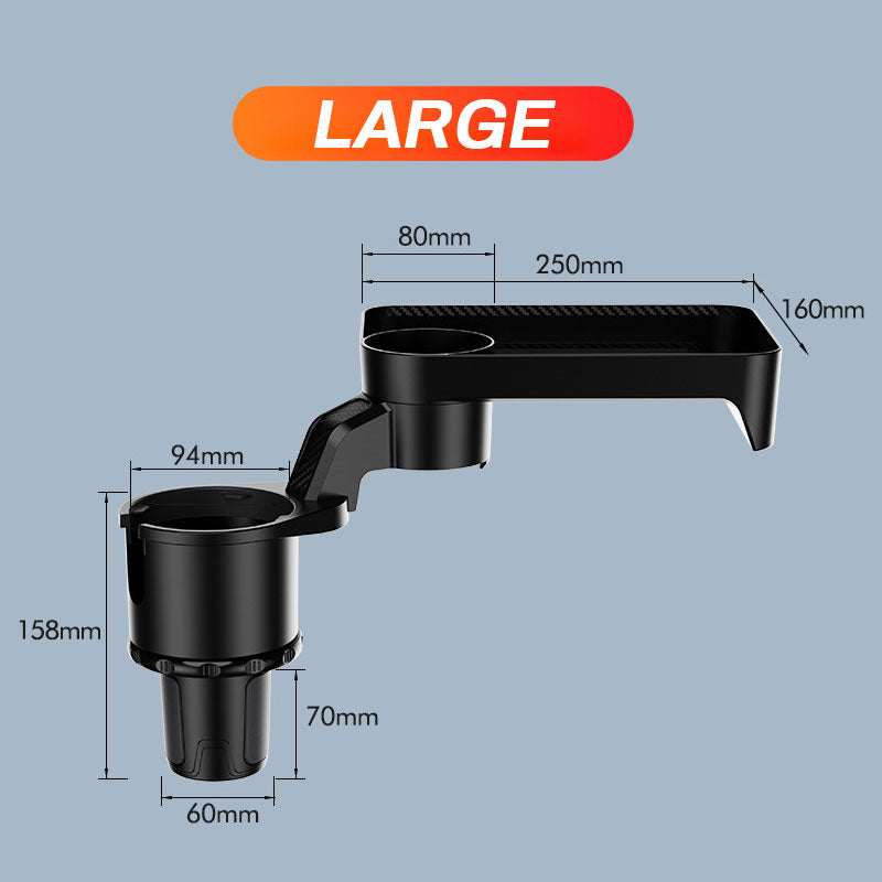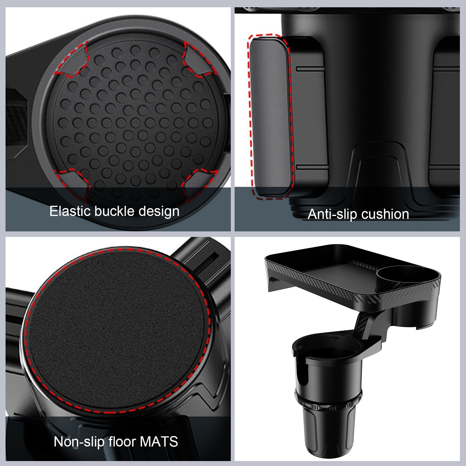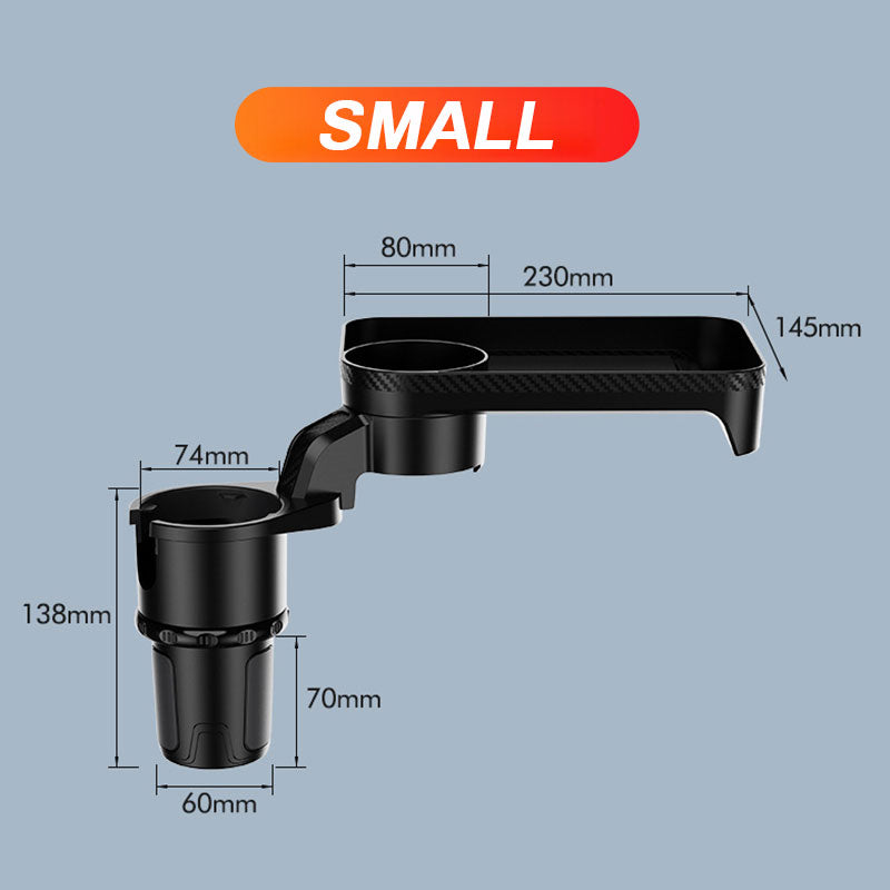 Mugghållaren för bilen är utrustad med 2 förvaringskoppar genom att justera den roterbara basen, liten i storlek och stor i kapacitet, i syfte att spara bilutrymme och kan rymma 2 drycker samtidigt. Den har 3 leder som kan rotera 360 grader, så att du fritt kan justera önskad position och höjd.