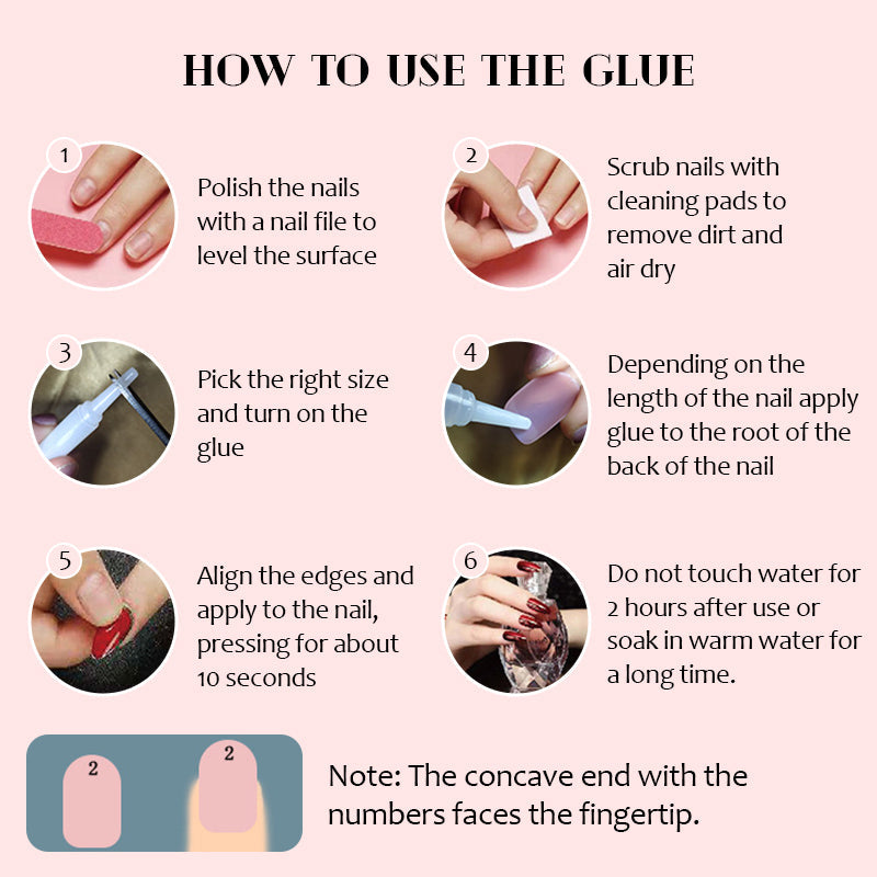 Med dessa naglar har en perfekt manikyr aldrig varit enklare. Rengör helt enkelt dina naturliga naglar, välj den perfekta storleken från vårt sortiment, applicera limmet jämnt, tryck och voila! Dina naglar kommer att se naturliga och vackra ut utan ansträngning.