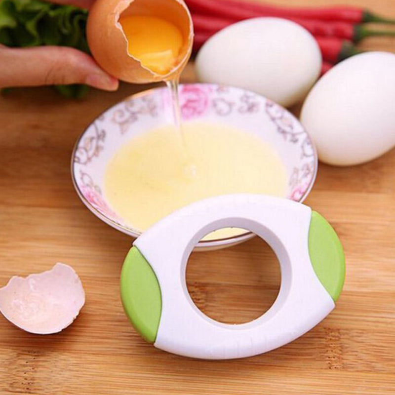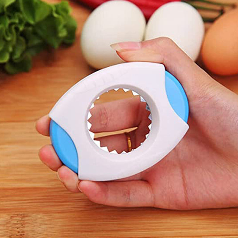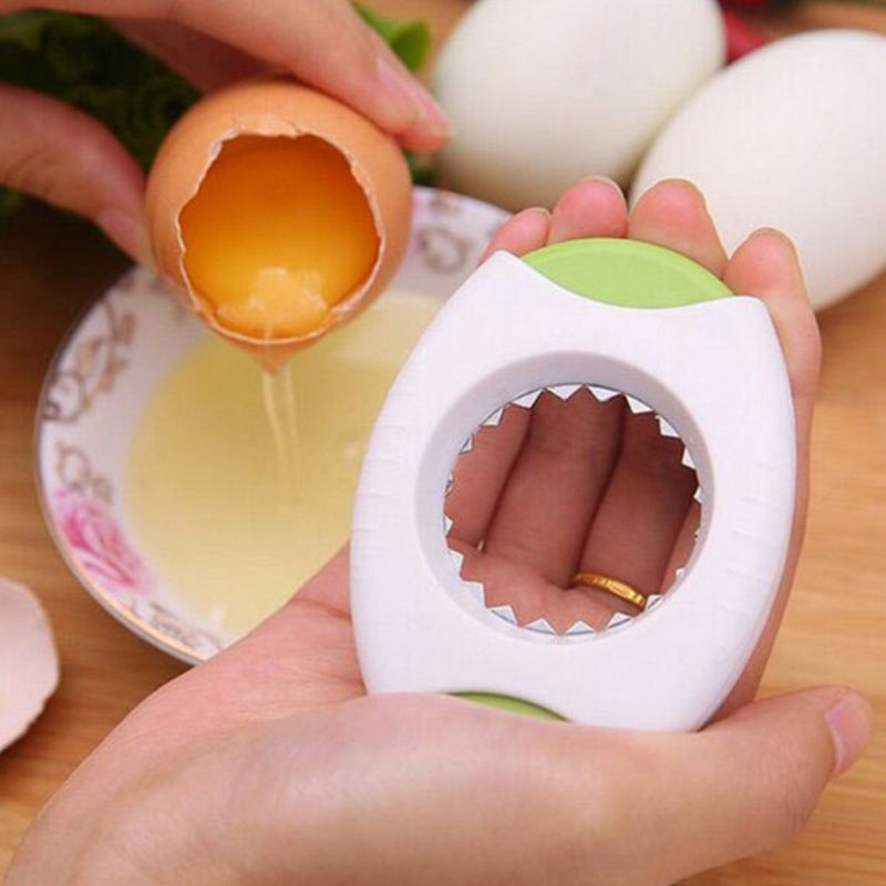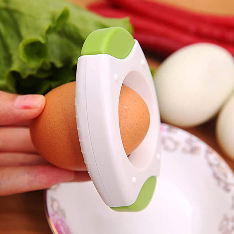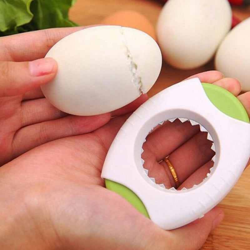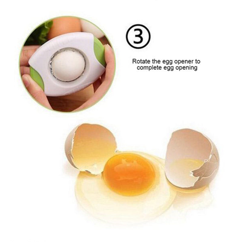 För in den inre ringen i ena änden av ägget på samma sätt som med en sax. När handtaget är stängt exponeras de yttre tänderna och tränger igenom äggskalet. När handtaget släpps dras tänderna tillbaka och en hel cirkel av äggskal skärs upp.