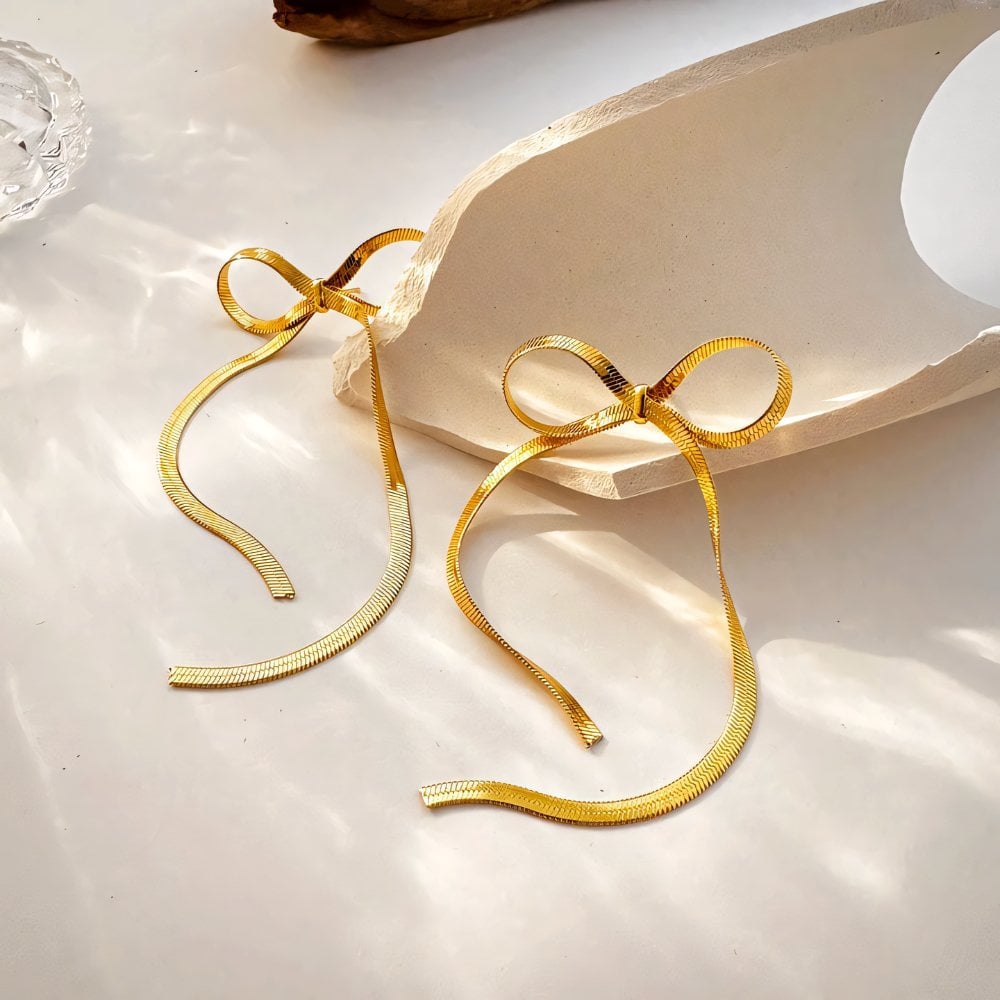 Stil: Dessa unika örhängen har en fiskbenskedja noggrant formad till en charmig rosett, som kulminerar i tofsändar som ger rörelse och stil. Dessa örhängen är tillgängliga i guld och silver och är designade för att tillgodose individuella stilar och preferenser, vilket ger en touch av elegans till alla kläder.