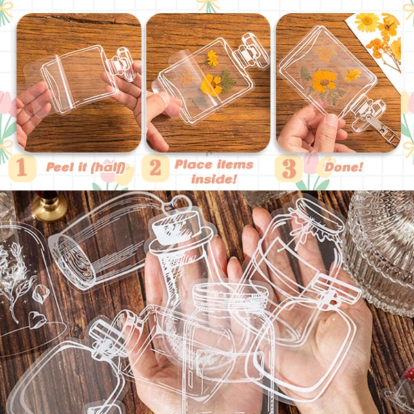 Detta paket med bokmärken kommer i olika genomskinliga flaskor med estetiskt utseende som kan designas med färgglada torkade blommor. Låter dig fritt släppa loss din kreativitet och kanalisera din kärlek till naturen för att skapa ditt eget unika blommiga bokmärke. Förbered helt enkelt dina insamlade torkade blommor eller blad, styla dem i bokmärket, tryck tillbaka dekalfilmen för att säkra och du är klar. Ingen mer komplicerad pressning, laminering och rörig skärning eller limning behövs. Det perfekta bokmärket för att göra bokläsningen ännu roligare med en extra touch av natur på dina sidor!