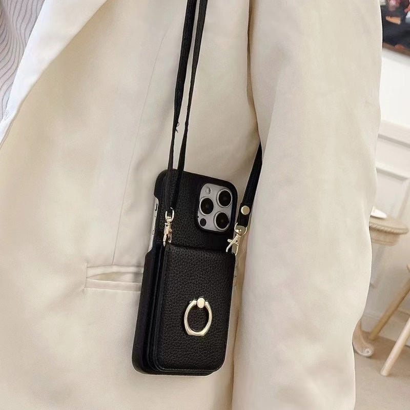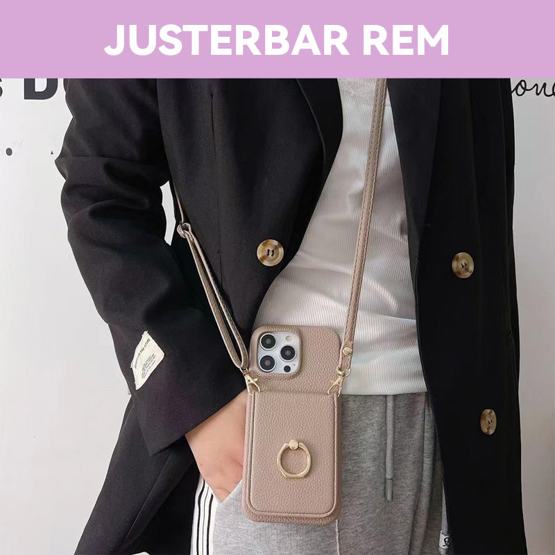 - Extra funktioner: Inbyggd korthållare, justerbar rem och ringhållare