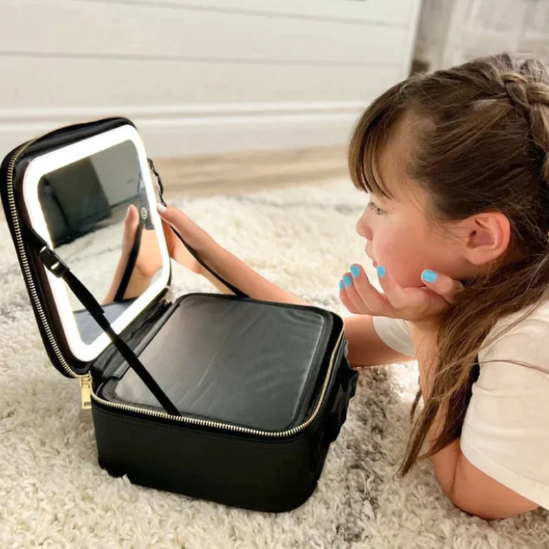 Vi presenterar vår upplysta kosmetikväska med stor kapacitet - den ultimata lösningen för dina sminkförvaringsbehov! Med en rymlig interiör och en helskärmspegel är denna handhållna, bärbara resesminkväska perfekt för att hålla alla dina kosmetika organiserade och inom räckhåll oavsett om du är hemma eller på språng.