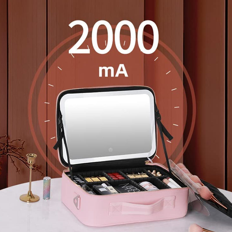 - Detta sminkskåp har en högkvalitativ LED-remsa som löper längs spegelns ovansida och ger en stark och jämn belysning så att du enkelt kan sminka dig även i svagt ljus. Belysningen drivs av ett uppladdningsbart batteri, vilket innebär att du kan använda den i timmar utan att byta batterier.