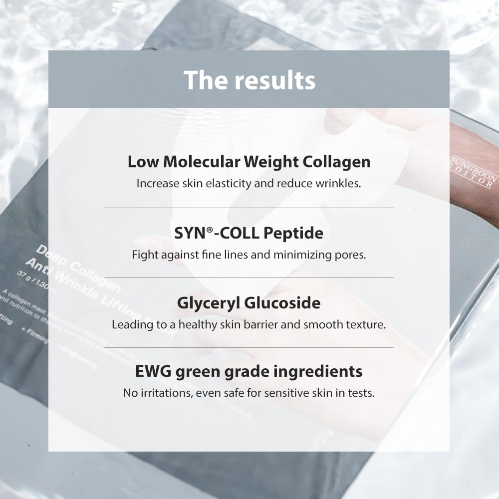- DJUP HYDRATION: Oligo-hyaluronsyran som finns i SUNGBOON Deep Collagen Anti Wrinkle Lifting Mask har en fuktgivande effekt som Àr överlÀgsen den hos vanlig hyaluronsyra. Den Äterfuktar snabbt hudens yta och penetrerar djupare hudlager vilket resulterar i en frisk och Äterfuktad hy.
