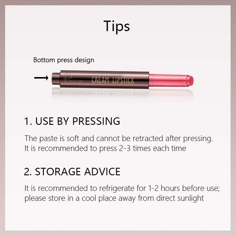 Fullfärg: Rik och fullfärgad, täcker lätt läpplinjer, modifierar läppformen perfekt och visar förförisk charm.