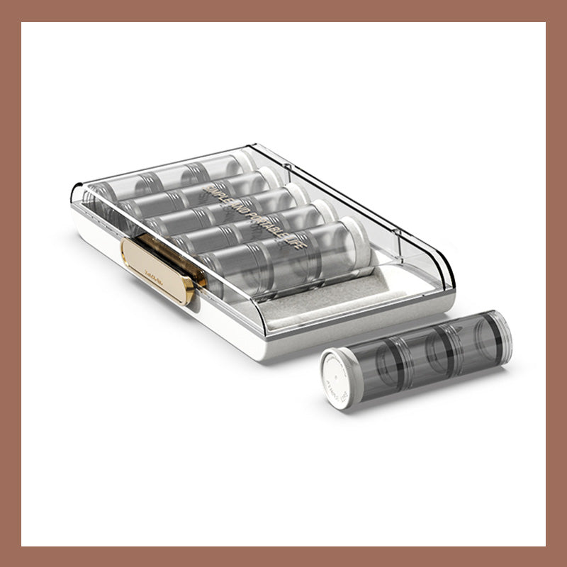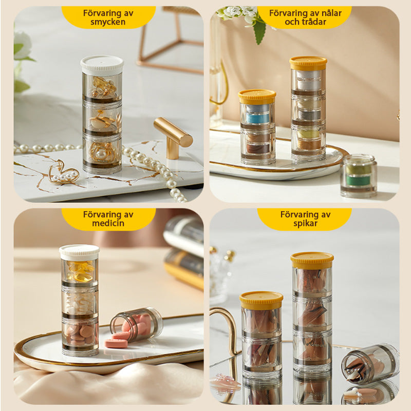 De små cylindriska behållarna kan roteras, kopplas samman och tas isär fritt. Detta gör att du kan anpassa och bygga om förvaringen efter dina specifika behov, oavsett om du behöver mycket utrymme eller bara en liten del.
