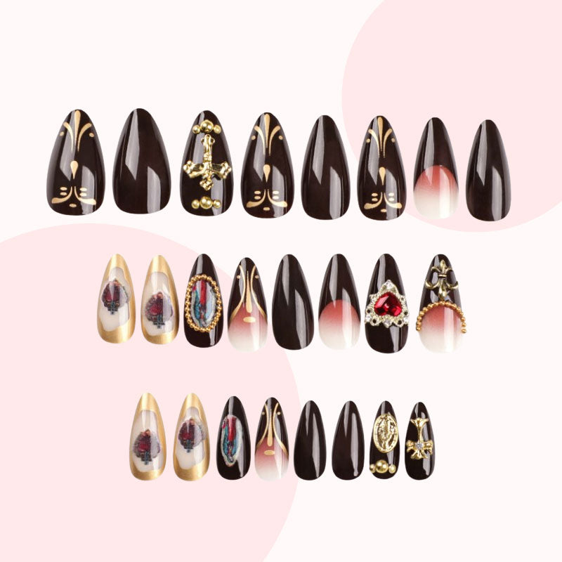 Varje nagel är dekorerad med vackra reliefkors och andra heliga motiv, som förhöjer din stil med en djup känsla av elegans och symbolik.