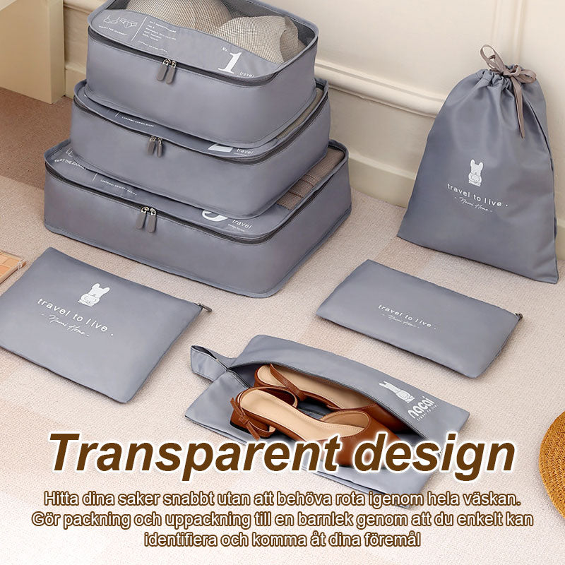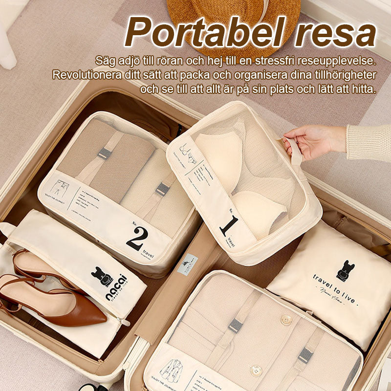 Flera Storlekar för Prydlig Packning Vårt set innehåller olika storlekar för att möta alla dina packningsbehov. Från stora påsar för kläder till mindre för underkläder och tillbehör, allt kan organiseras prydligt och lättillgängligt. Spännesdesignen håller dina saker säkra och förhindrar att de flyttar sig runt. 👗