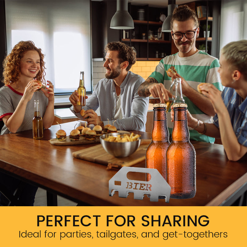 Sluta slösa tid och börja njuta mer! Ta tag i vår Quad Beer Opener & Carrier och bli den ultimata värden (eller den mest effektiva ölentusiasten) på ditt nästa evenemang! Prost!